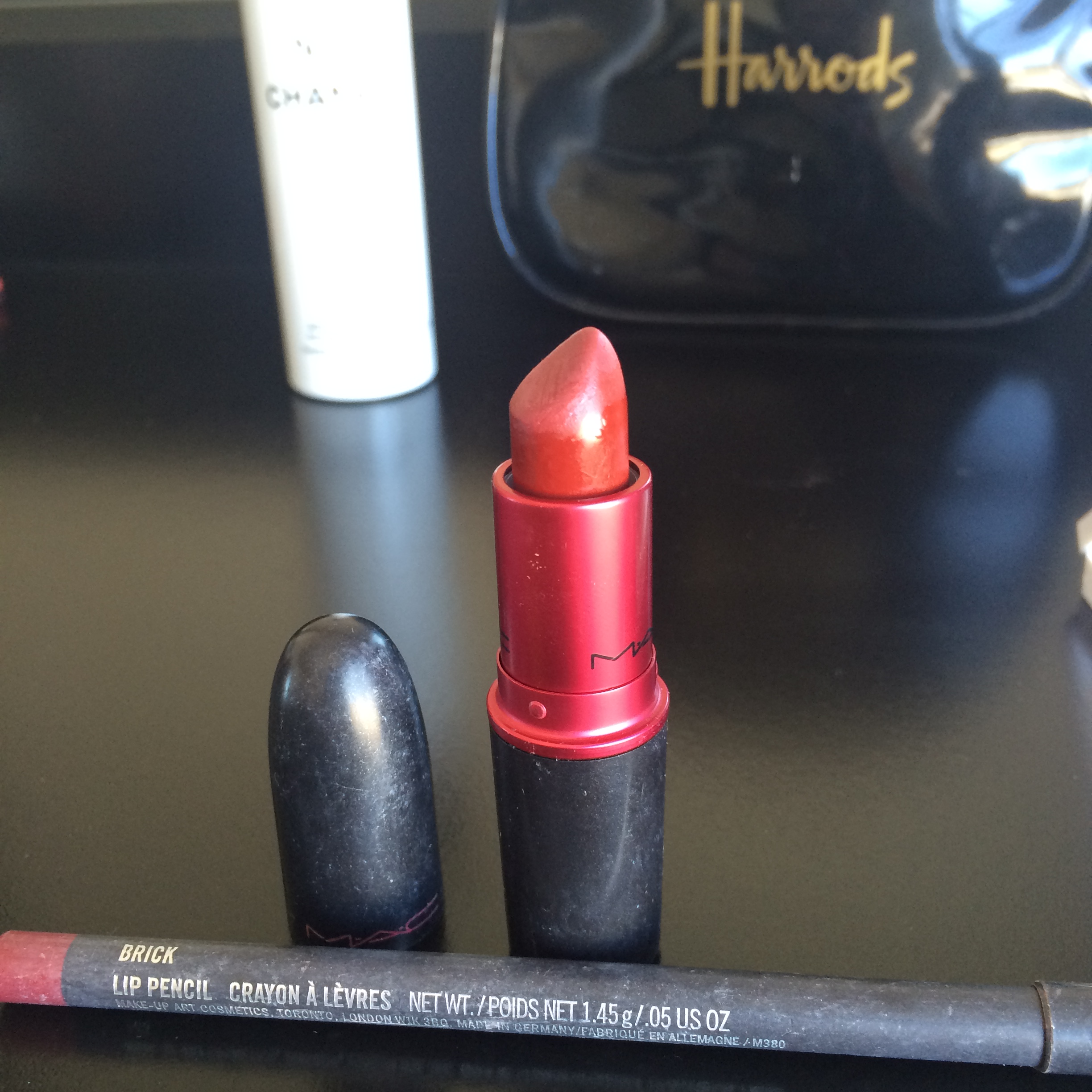 LIPS: Mac Lipstick and Lip Pencil in Matte Viva Glam and Brick