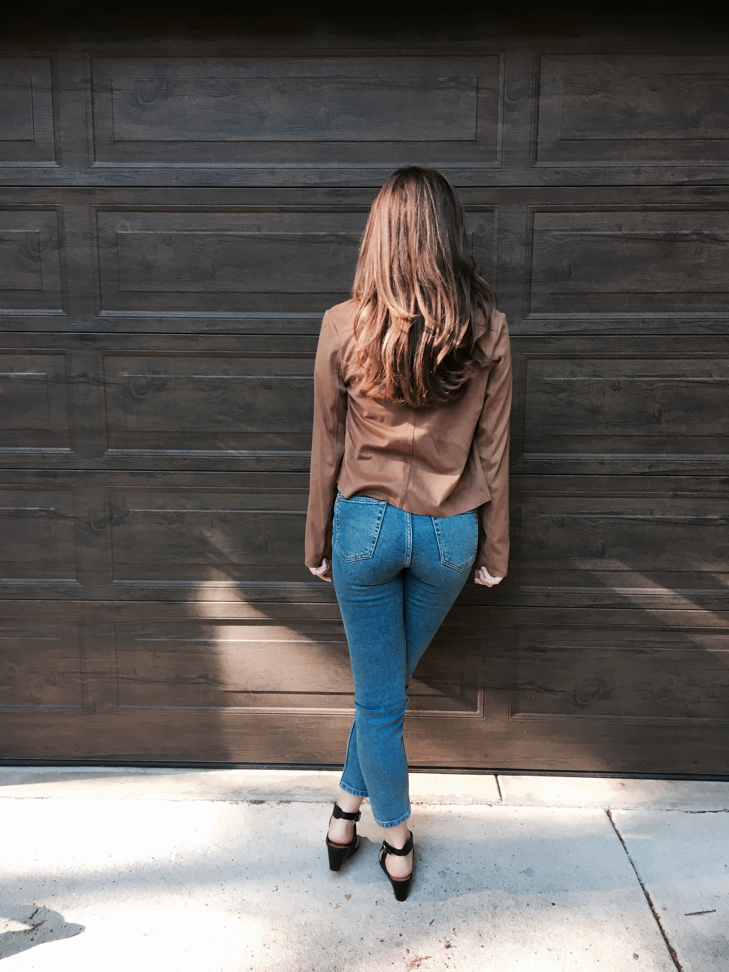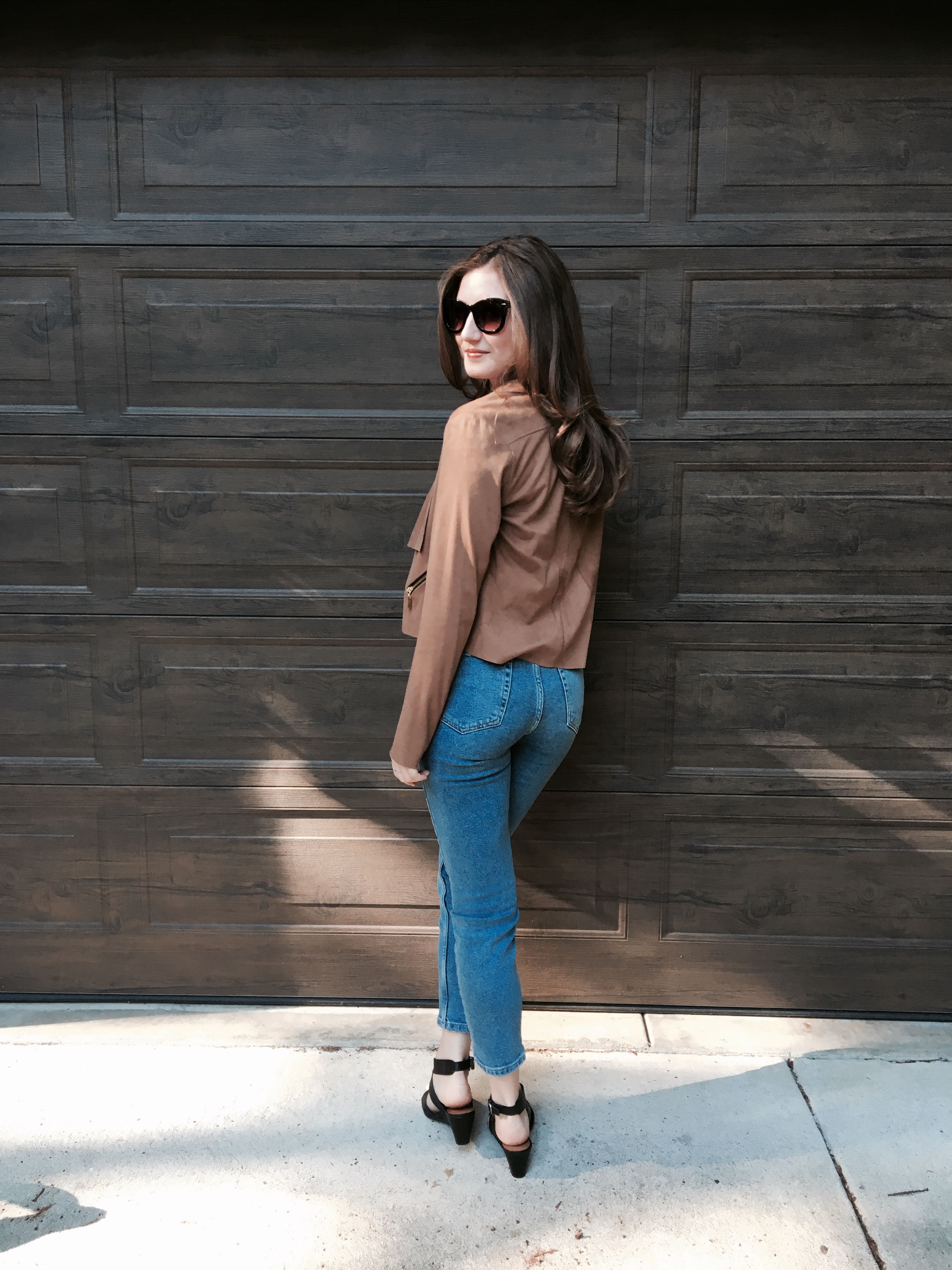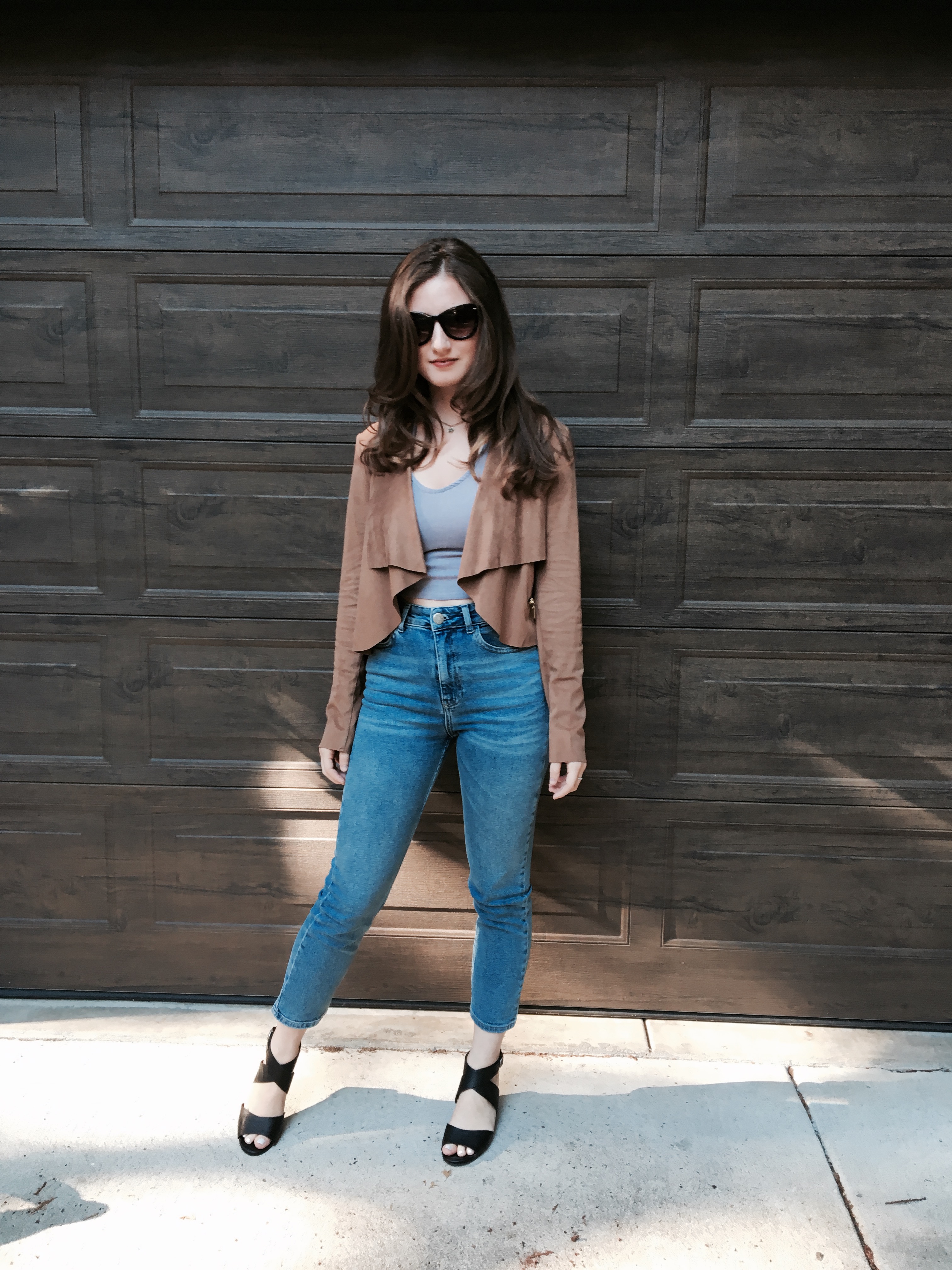Suede Jacket, High waisted jeans, Wedge,  Crop Top